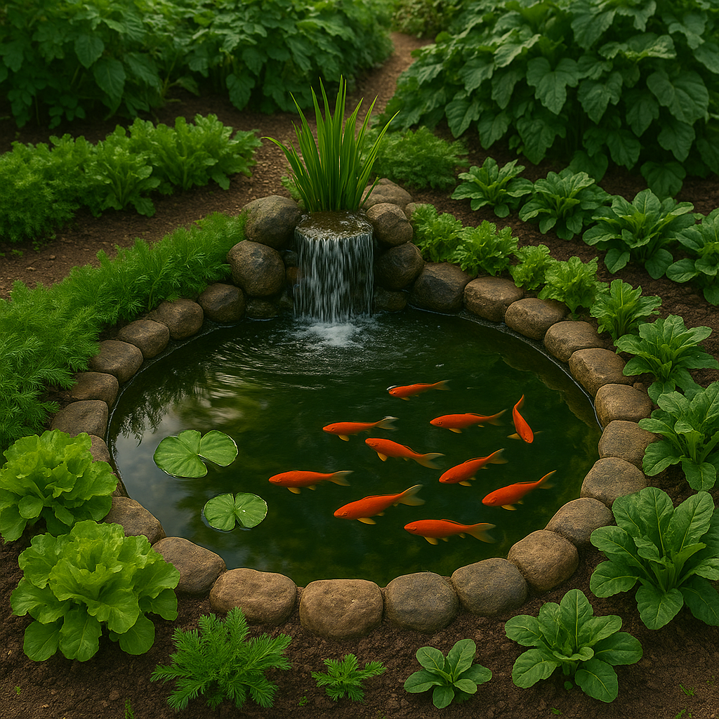 Complete AFRA ecosystem: pond with fish, organic garden perimeter and composter. Low-maintenance natural design.
