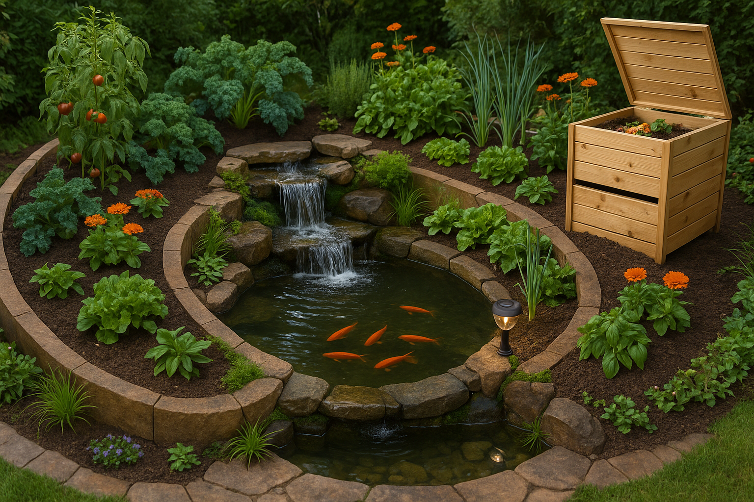 Advanced version with dual-waterfall pond, solar LED lighting and automatic irrigation using biofiltered water.